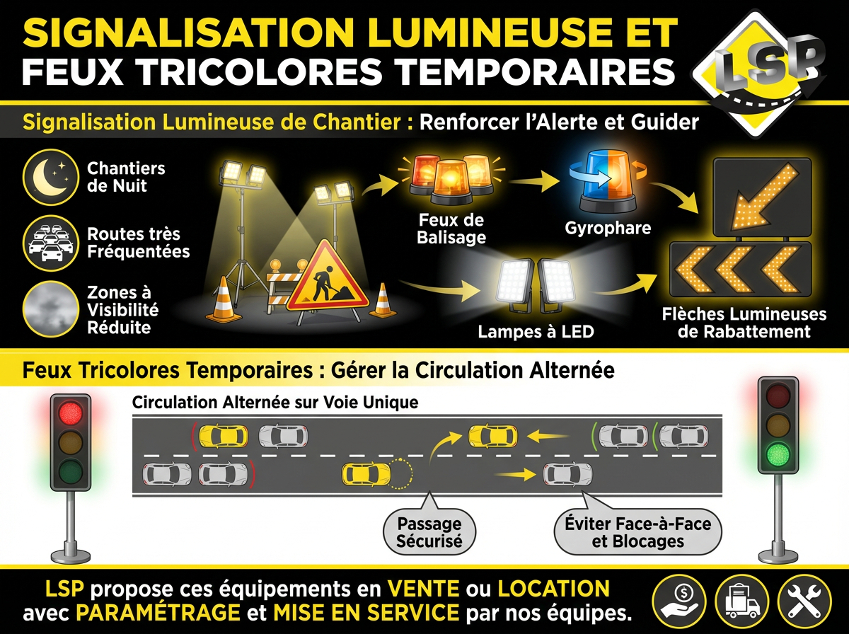 Les feux tricolores temporaires sont particulièrement adaptés aux circulations alternées sur une voie unique. Ils organisent le passage des véhicules de manière sécurisée, en évitant les face-à-face et les blocages. LSP propose ces équipements en vente ou en location de signalisation de chantier, avec paramétrage et mise en service réalisés par nos équipes.