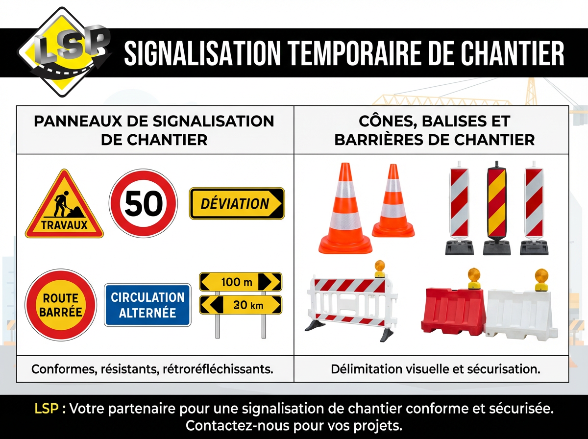 <Au-delà du respect des textes, la qualité du matériel de signalisation de chantier est déterminante. LSP privilégie des produits homologués, certifiés CE et conformes aux normes françaises en vigueur. Les panneaux, cônes, barrières et systèmes lumineux sont sélectionnés pour leur visibilité, leur stabilité et leur résistance aux chocs comme aux intempéries.