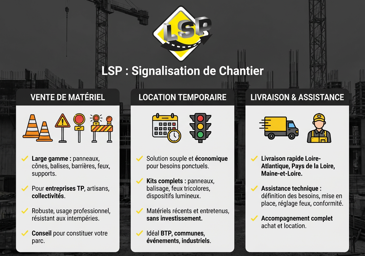 Basée en Maine-et-Loire, LSP intervient en priorité en Loire-Atlantique et en Pays de la Loire, avec une capacité de livraison rapide sur vos chantiers. Notre équipe assure également l’assistance technique : aide à la définition des besoins, mise en place des dispositifs complexes, réglage des feux tricolores temporaires, vérification de la conformité d’ensemble.