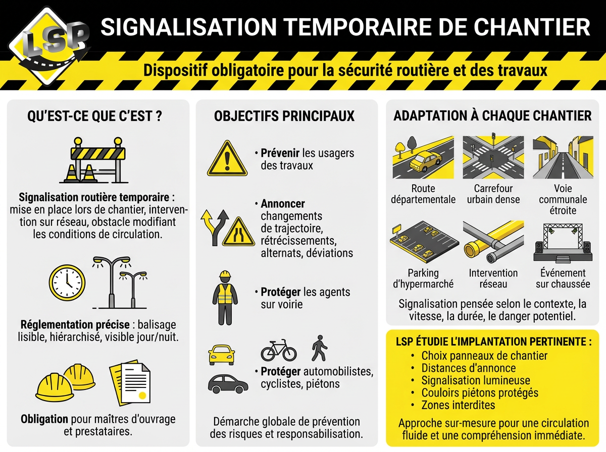 La signalisation temporaire de chantier n’est jamais un simple accessoire posé au bord de la route. Elle conditionne la sécurité de vos équipes, la protection des usagers et la bonne lisibilité de vos travaux. Une signalisation chantier temporaire claire et cohérente limite les risques d’accident, réduit les ralentissements inutiles et renforce l’image professionnelle de votre structure. Implantée à Liré-Orée d’Anjou, LSP – La Signalisation Professionnelle – accompagne les collectivités, entreprises de travaux publics, industriels et particuliers dans la mise en place de dispositifs fiables, conformes aux normes et adaptés à chaque situation de chantier.